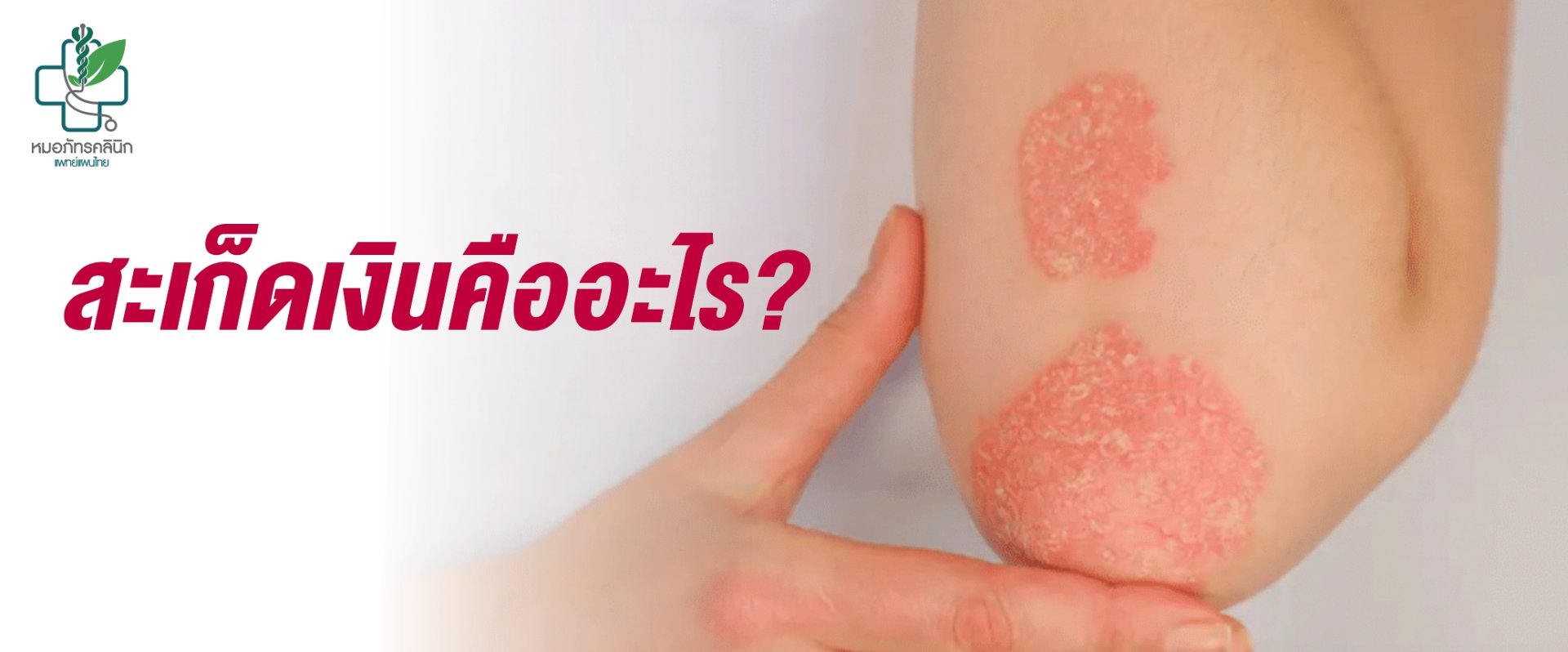 1. รอยโรคสะเก็ดเงินอันเกิดจากเลือดและลม ผิวหนังบริเวณรอยโรคจะแบนราบ มีลักษณะแห้ง มีสะเก็ดบางๆ ละเอียด สีขาวปกคลุมอยู่ สะเก็ดจะหลุดร่วงได้ง่าย มักพบสะเก็ดตกตามอยู่ตามที่นอน